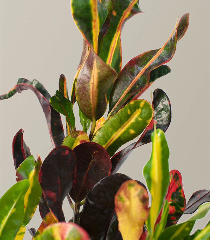 קרוטון פטרה הוא צמח טרופי מרשים המפורסם בזכות עליו הצבעוניים והמגוונים. כל עלה הוא יצירת אמנות בפני עצמה, עם דוגמאות ייחודיות בשילובי צבעים מרהיבים של ירוק, צהוב, כתום ואדום. העלים גדולים, עבים ומבריקים, והצמח יכול להגיע לגובה של עד מטר וחצי בתנאים אידיאליים. ככל שהצמח מקבל יותר אור, כך צבעיו עזים יותר. הקרוטון מוסיף אלמנט טרופי דרמטי לכל חלל ויכול לשמש כנקודת מוקד מרשימה בעיצוב הבית. זהו צמח חזק ועמיד, המתאים גם למגדלים מתחילים.